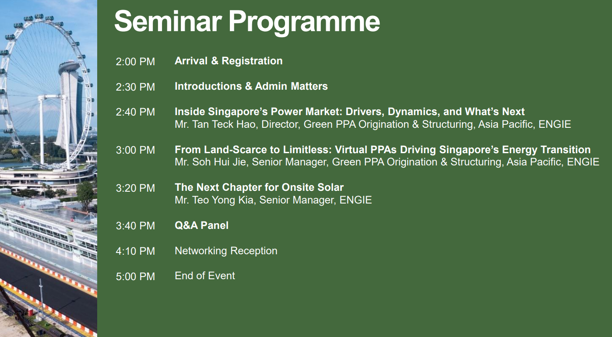 This SGBC Seminar, supported by SGBC Member ENGIE, will offer practical insights to help organisations turn energy strategy into a competitive advantage. Discussions will explore the changing dynamics of Singapore’s power market, the role of Virtual Power Purchase Agreements in expanding renewable access, and approaches to optimise both new and existing solar assets. Case studies will highlight practical strategies to align sustainability goals with business growth and resilience.